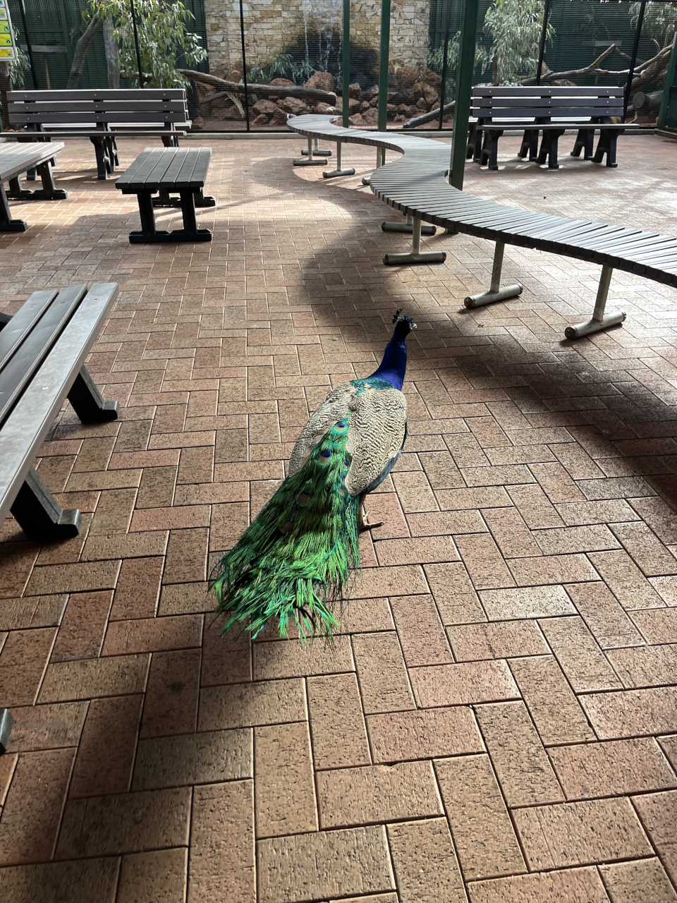 カバシャムのクジャクたちは、特定のケージの中ではなく、パーク内の通路や広場を自由に歩き回っています。突然、目の前を首を揺らしながら横切る姿は、最初はちょっとびっくりかも!?