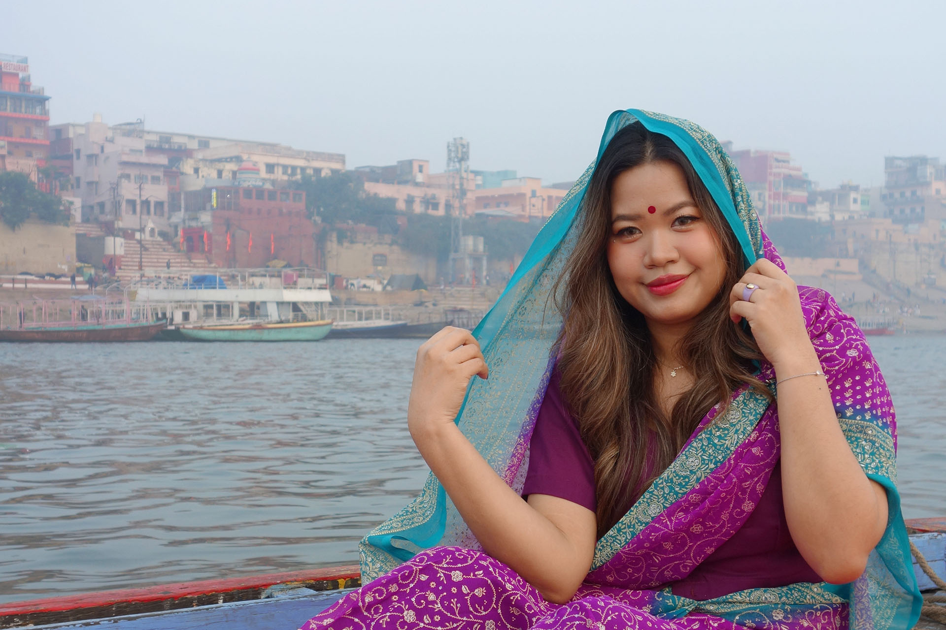 ガンジス川も一瞬でファンタジーの世界に。インドの雑多な街並みにも不思議と映えるサリー。