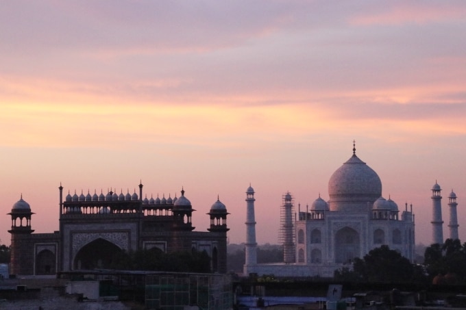 タージマハルを眺めるカフェより、タージマハルと朝日鑑賞