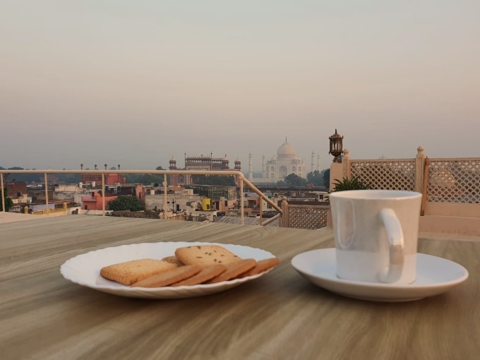 チャイ、紅茶、コーヒーから1ドリンクお選び頂け、簡単ですがクッキーなどのスナックをご用意しております。タージマハルと朝日を見ながらのティータイムは格別です。