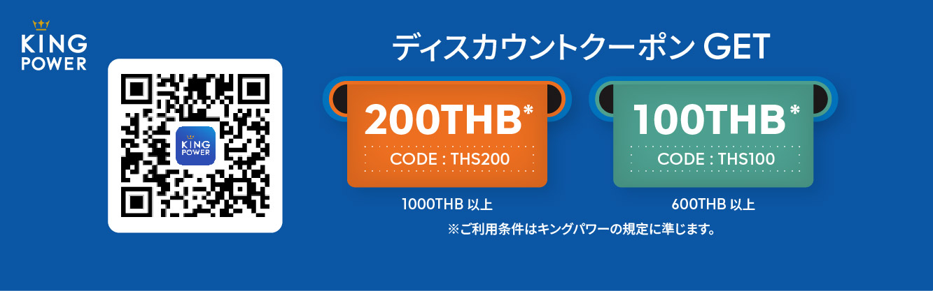 🎁キャンペーン内容🎁キングパワー(店頭またはオンライン)で600バーツ以上のお買い物をすると、100バーツ分1,000バーツ以上のお買い物をすると、200バーツ分のディスカウントクーポンをプレゼント!