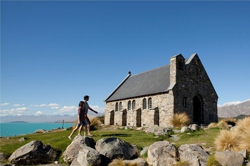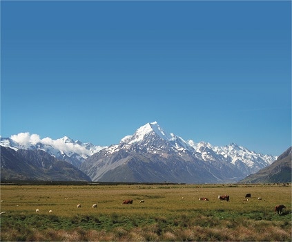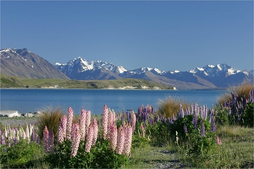 南アルプスの景色をお楽しみいただきながらバスはテカポへと進みます。 テカポ湖畔でのショートストップ、テカポ湖を出て、プカキ湖のブルーに輝く湖の景色を眺めながらマウントクックへと向かいます。