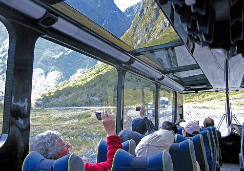 自然の作り上げた美しいフィヨルド、世界遺産ミルフォードサウンドをクルーズ船にて廻ります。送迎のバスは車窓からの風景を最大限楽しめるよう、座席の配置や角度にも工夫を凝らしています。天井部分にもガラス窓があり、雪を冠った美しい山々の姿もゆったりと眺めることができます。