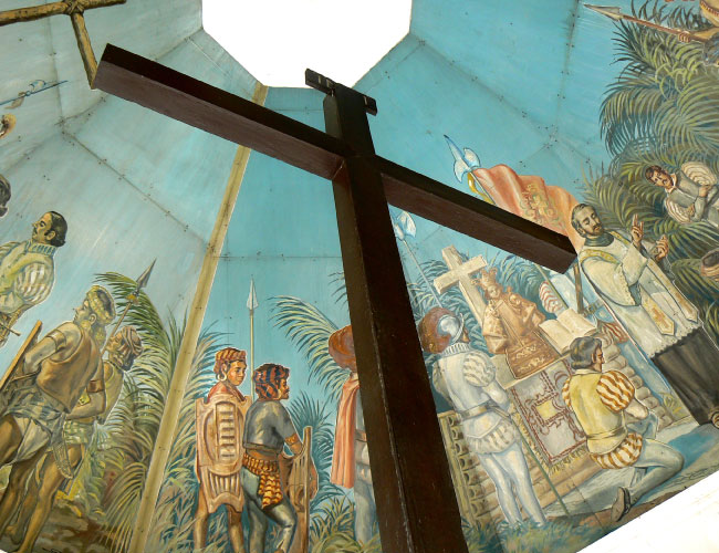 十字架を収めた八角堂の周辺は多くの観光客でにぎわいます。八角堂の中に入ると、中央に鎮座する木製の大きな十字架と、天井一面にマゼランが上陸した当時の様子を描いた宗教画を目にすることができます。