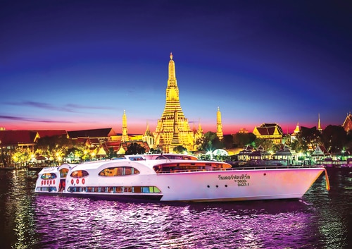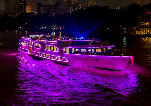 食事はタイ料理からお寿司まで楽しめるインターナショナルブッフェで、内装はシックで高級感があります。船内に喫煙スペースがあるのも特徴です。 タイ舞踊やライブミュージック、ものまねショーなど日替わりのエンタメと共に、バンコクの夜を華やかに楽しむことができます!