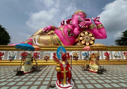 全長16メートルのピンクの横たわるガネーシャ像は圧巻!ネズミの耳に願いをささやくユニークな体験を。