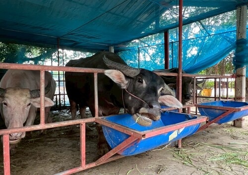 高さ39メートルの黄金の立像がそびえる寺院。さらに水牛への餌やり体験(別途20バーツ)で癒しのひとときを。