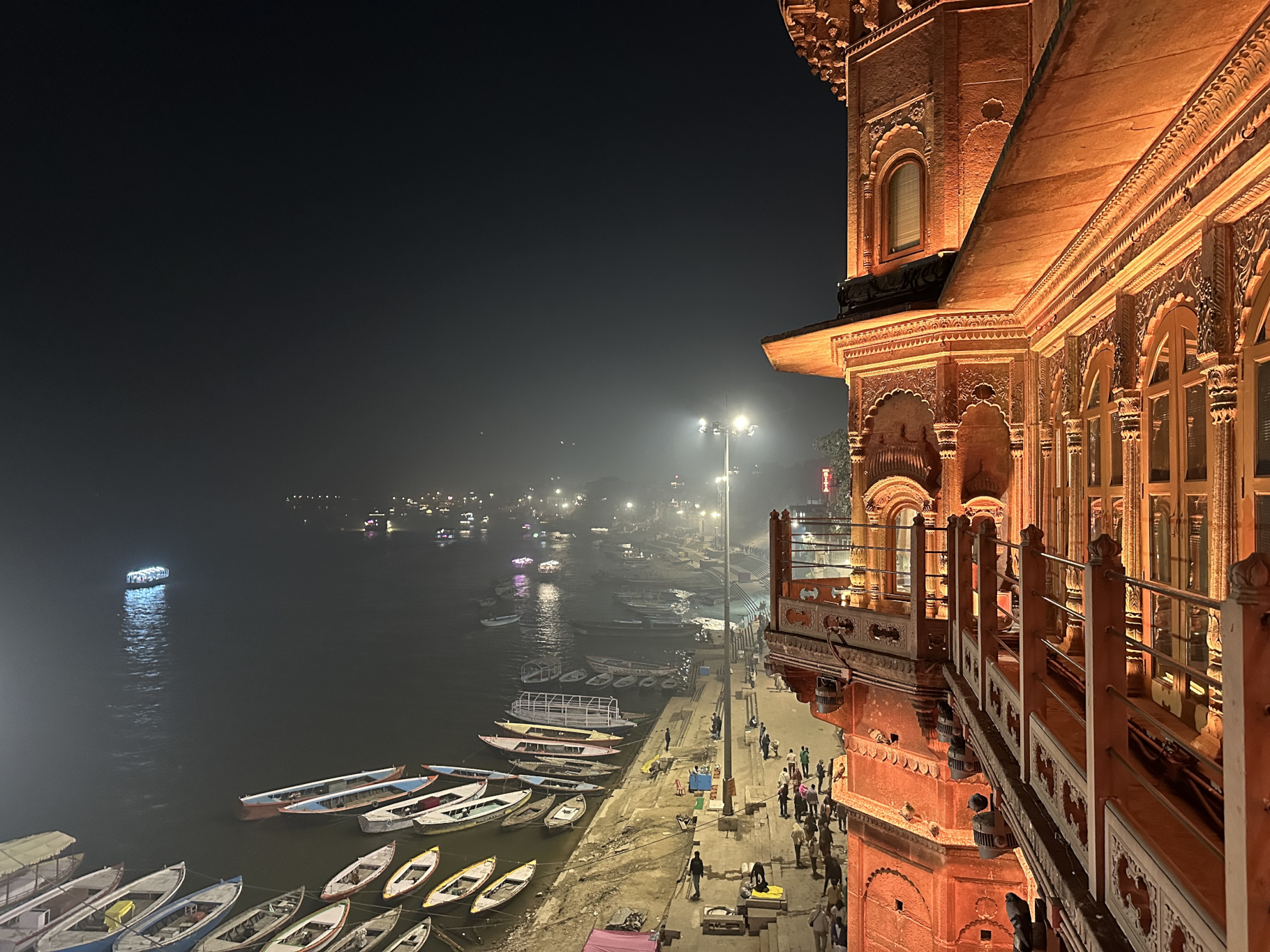 プージャが終わった後のガート周辺は、昼間とは一変して、神秘的な光と影のアートが広がる迷宮へと姿を変えます。ライトアップされたホテルのシルエットが川面に揺れ、露店から漏れる柔らかな灯りが、行き交う人々のサリーを色鮮やかに浮かび上がらせる光景は、どこを切り取っても幻想的。夜風に吹かれながらガートの石段を歩けば、スパイスの香りと祈りの残り香が混じり合い、まるで異次元の世界に迷い込んだような特別な高揚感に包まれます。