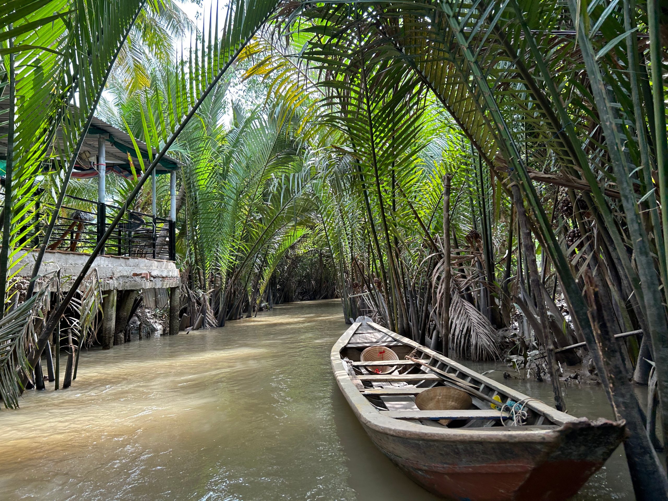 ツアーのハイライトは、メコン川の細い水路を手漕ぎボートで進むジャングルクルーズ。