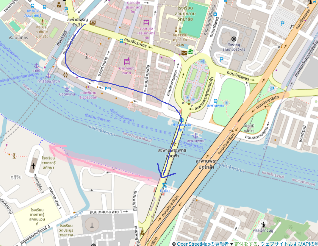 橋の途中くらいから、明らかに対岸の川沿いに人が集まっているのが見えたのであのあたりがベストポジションだと確信!20:45のショー開始に合わせて20時過ぎからタイ人たちがレジャーシートを敷いて場所取りをしていました!地図のピンクのあたりに屋台なども出ていてにぎやかな鑑賞スポットになっています。