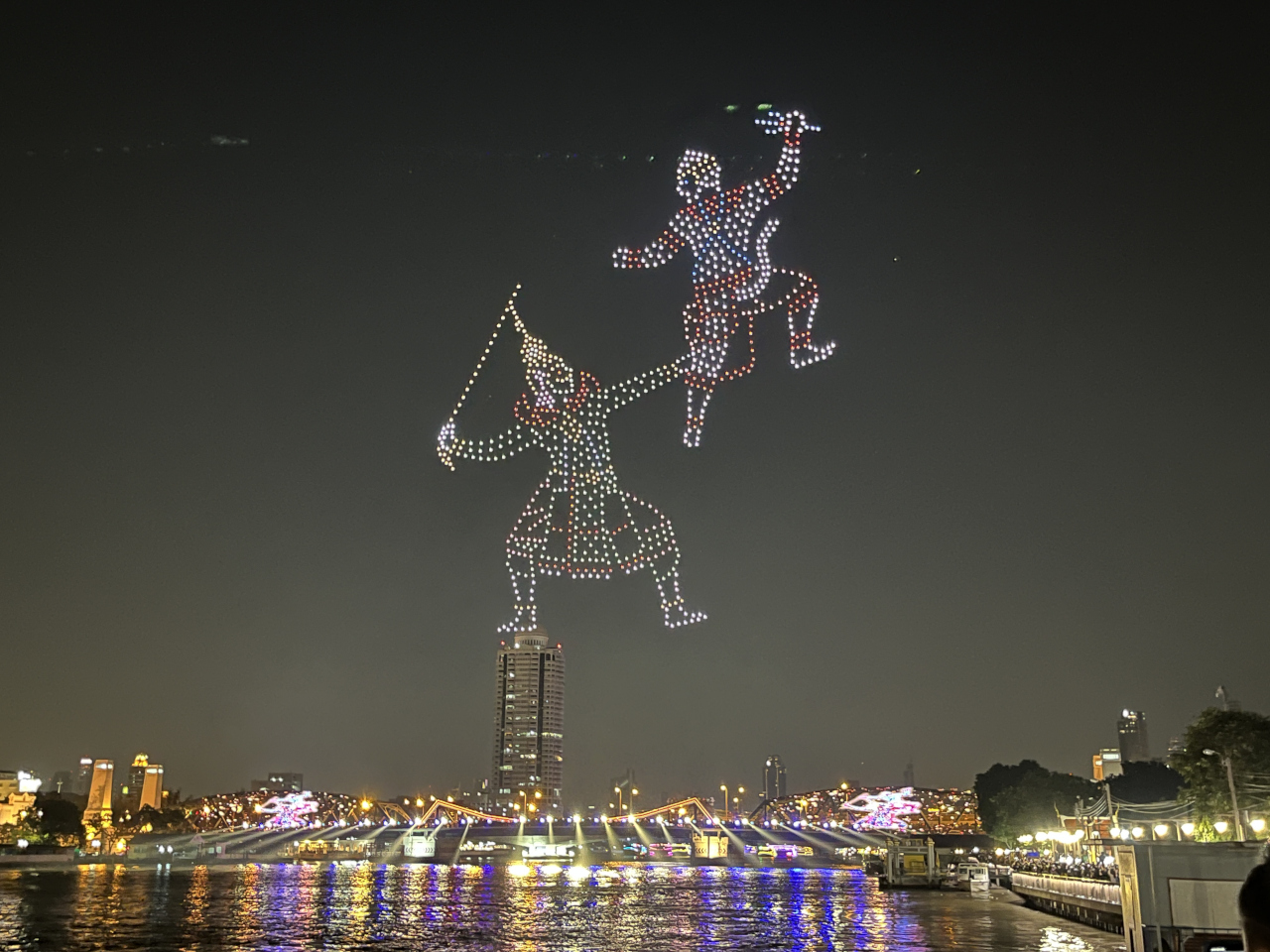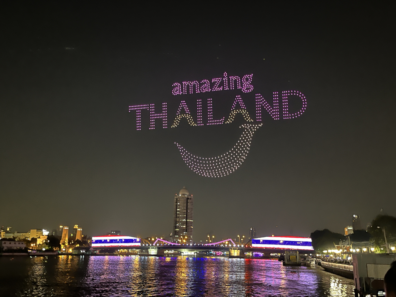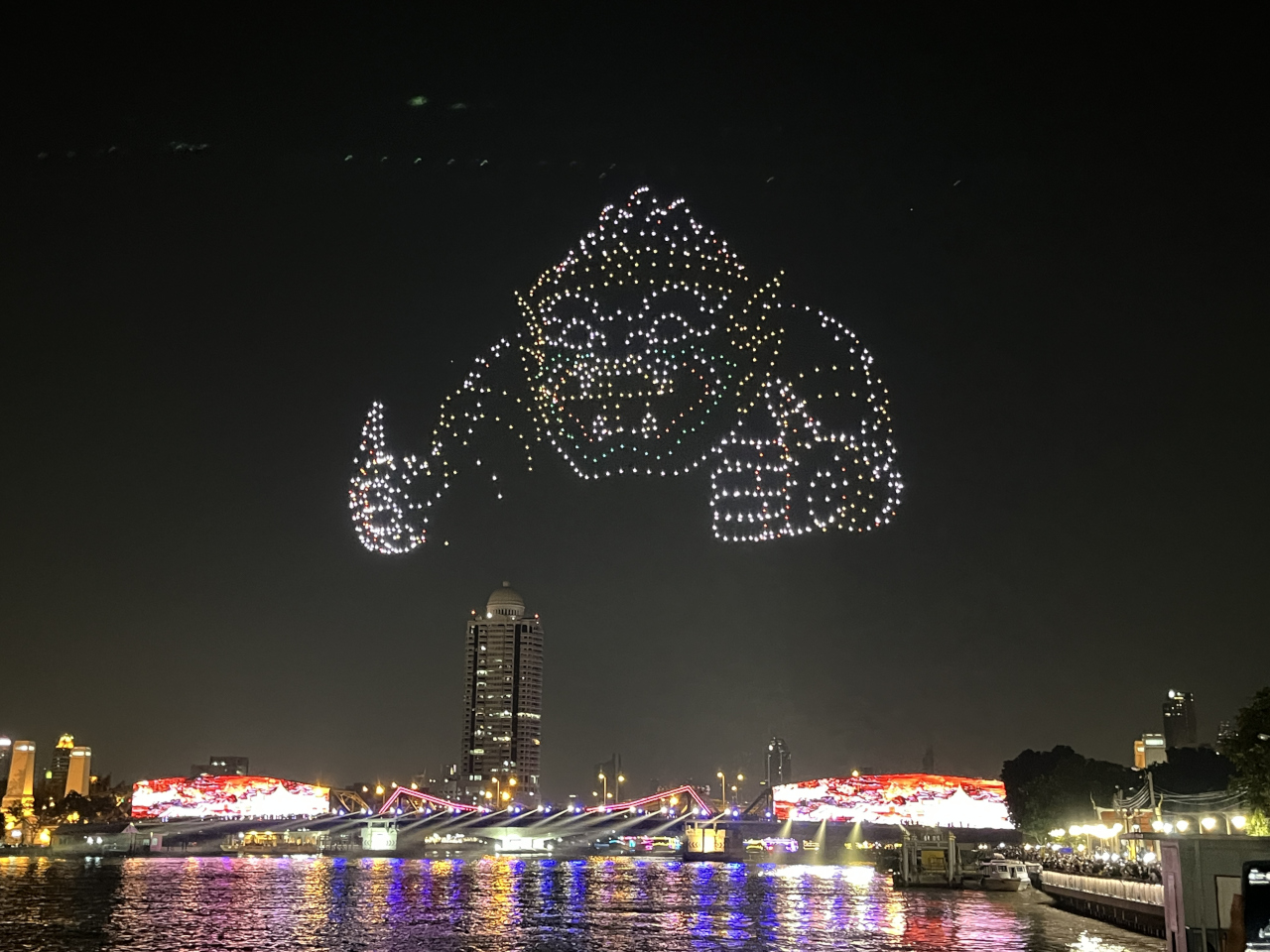 次々とタイを象徴するモチーフが現われて目が離せない。さすがにドローン1000機もあると迫力満点!中には花火が出るタイプの演出もありました。写真よりずっと大きく近く見えるし、次は何が現れるんだろうとわくわくしながら見守りあっという間の15分でした!これを無料でやるなんてさすがタイ。。