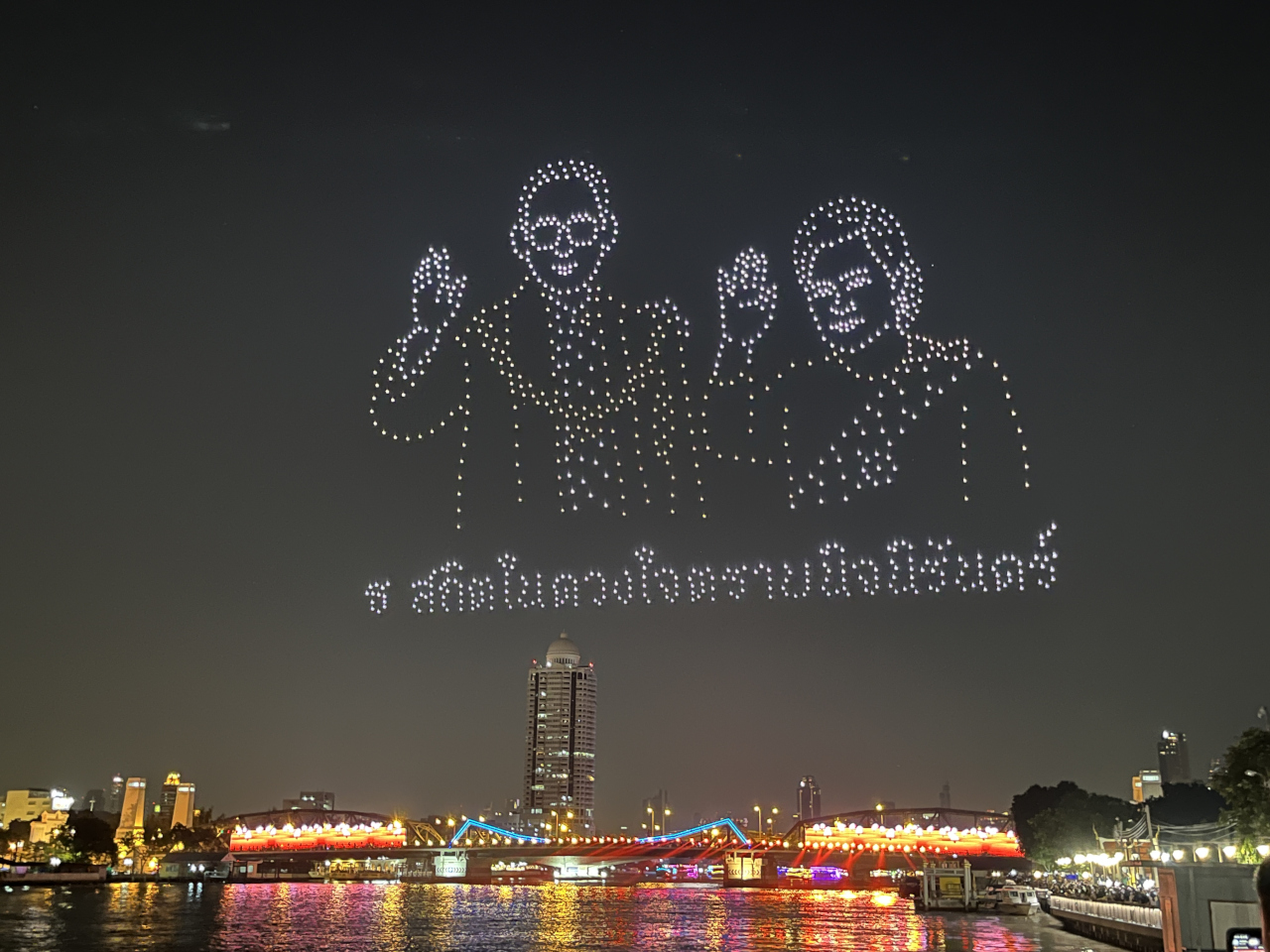20:45の定刻に約15分のドローンショーがスタート!今年のテーマは「– Light of Siam ~母なる大地へ~」ということで、「国民の母」として深く崇敬されるシリキット王妃陛下の慈悲深いご厚意に敬意を表すものとなっています。