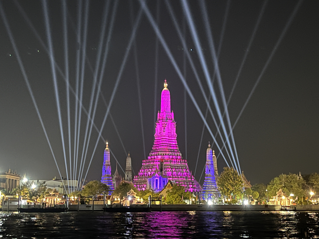 そのほかにも川沿いの各所でレーザーショーとライトアップがされています。ワットアルンもレーザーで照らされピカピカ!普段の黄金のライトアップも素敵ですがこれも珍しくていいですね♪